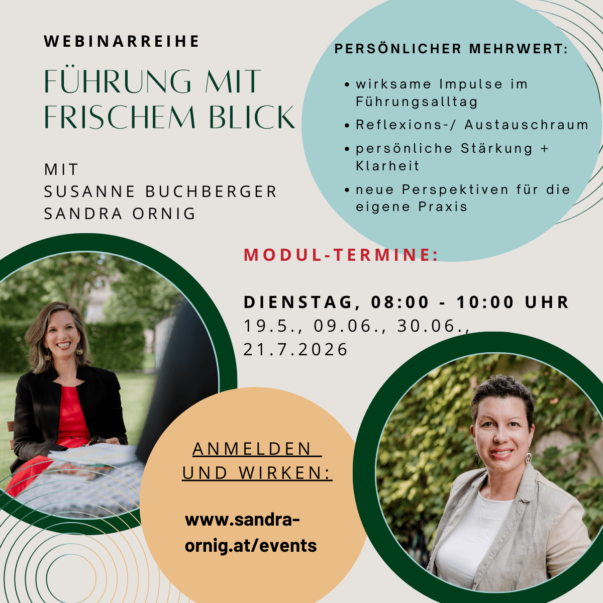 Die Webinar-Reihe schafft Raum, wo Sie erleben, wie stärkend es sein kann, Führung nicht allein zu tragen, sondern Erfahrungen zu teilen, voneinander zu lernen sowie zu forschen – wertschätzend, praxisnah und mit einer guten Portion Leichtigkeit und Humor.
